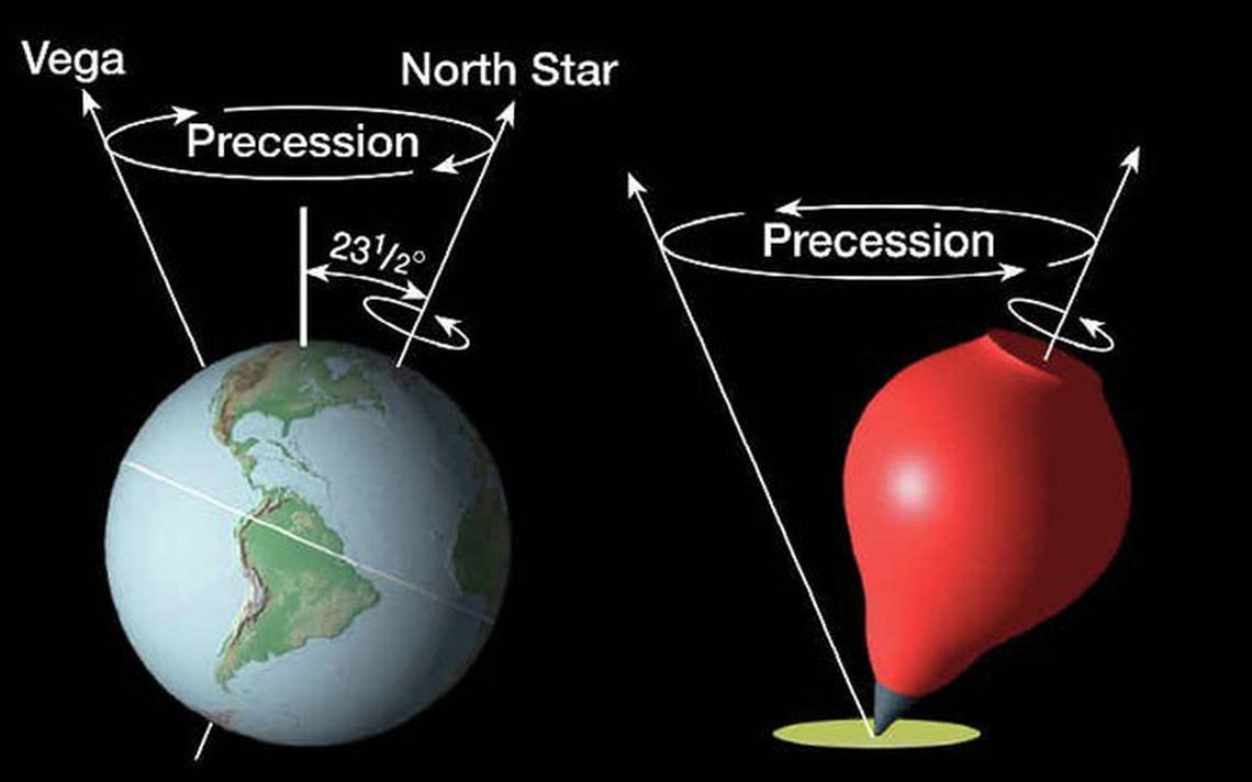 The Earth wobbles in space like an out-of-balance top. Each full wobble takes about 25,772 years. The reason for the slow wobble is that the Earth is not a perfect sphere. If the Earth were a perfect sphere there would be no precession at all, but the equatorial diameter of the Earth is larger than the polar diameter.