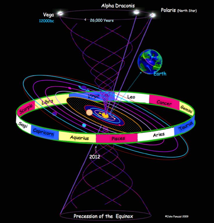The 1st Motion of our Earth is ‘Rotation of the Earth Itself’ and for this man feeds on the light from our Sun each day and produces kundakin and askokin psyche hydrogens for our moon.  The 2nd Motion of our Earth due to ‘Revolution of our Earth around our Sun’ that results in the arising of the 4 seasons or 4 qualitatively different periods in 12 months and changes the geography and geomancy of our environment over each year to provide different impression, air and ordinary foods for which man feeds on.  It is a more massive recurring change to humanity.  The 3rd Motion of our Earth is from the ‘Precession of the Equinox’ a gyro effect that results in the 12 Astrological Ages each Platonic Year or Great Year (25,776 years or 25,860 years or 25,920 years depending on different astrologists' experience) for which different brightest stars (group suns) forming an astrological constellation of human experience visible in the night sky and actually out from actual astronomical galaxies.  These immediately being-psyche hydrogens with cosmic properties senders would nourishes our receiver Earth and notably, the civilizational life of man in the Organic World at the MI-FA Interval of the (our) Ray of Creation.  The Organic Film on the surface of our Earth will go through the Historical Biocosmic Evolution of Beings and the current Homo sapiens (modern man) will experience both civilizational quantitative changes and qualitative transformation – for each or the 12 Astrological Ages – each period being about 2,148 years.